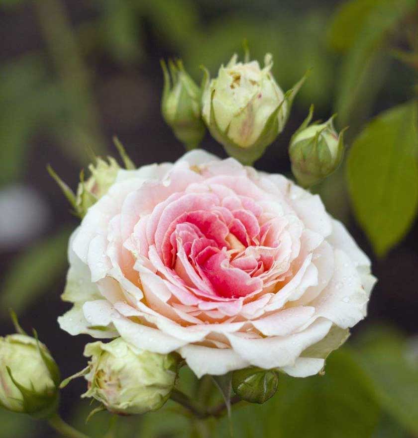 кремово-белого в центре до темно-розового по краям лепестков. - Повторное цветение: Роза цветет повторно (ремонтантная), обеспечивая красивые цветы на протяжении большей части лета и до осени.
